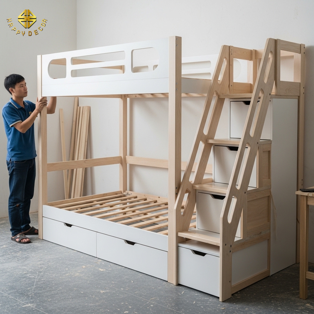Kết cấu vách đôi chịu tải: Thay vì dùng khung gỗ mỏng manh, Happy Décor thiết kế hệ giường tầng bằng các module vách đôi ghép mòi $45^{\circ}$. Kỹ thuật này giúp hệ giường chịu được tải trọng lên đến 300kg, không rung lắc, không tiếng động khi trẻ đùa nghịch.