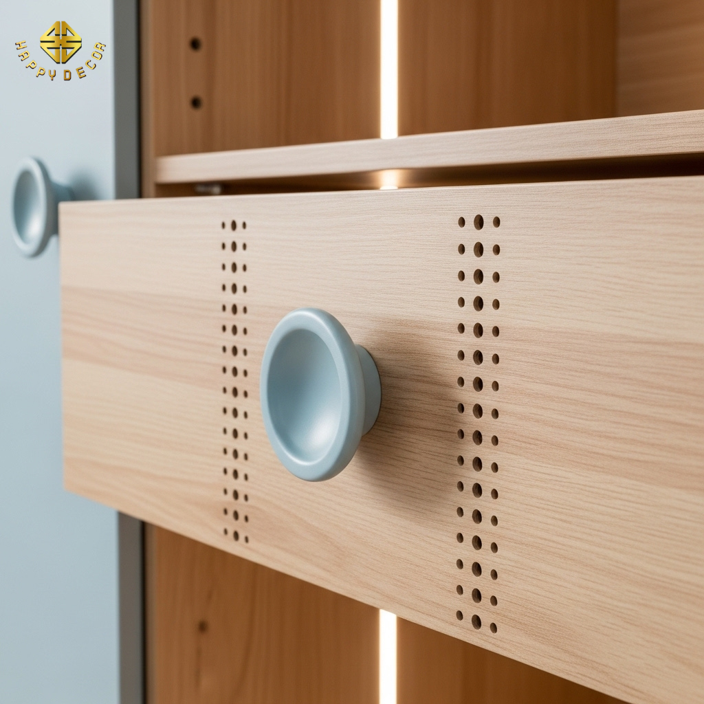 Phụ kiện giảm chấn toàn phần: Mọi cánh tủ, ngăn kéo trong phòng trẻ đều được Happy Décor trang bị bản lề và ray trượt giảm chấn cao cấp. Điều này ngăn chặn hoàn toàn việc trẻ bị kẹt tay khi đóng tủ – một chi tiết nhỏ nhưng thể hiện sự tận tâm và chuyên nghiệp của người làm nghề.