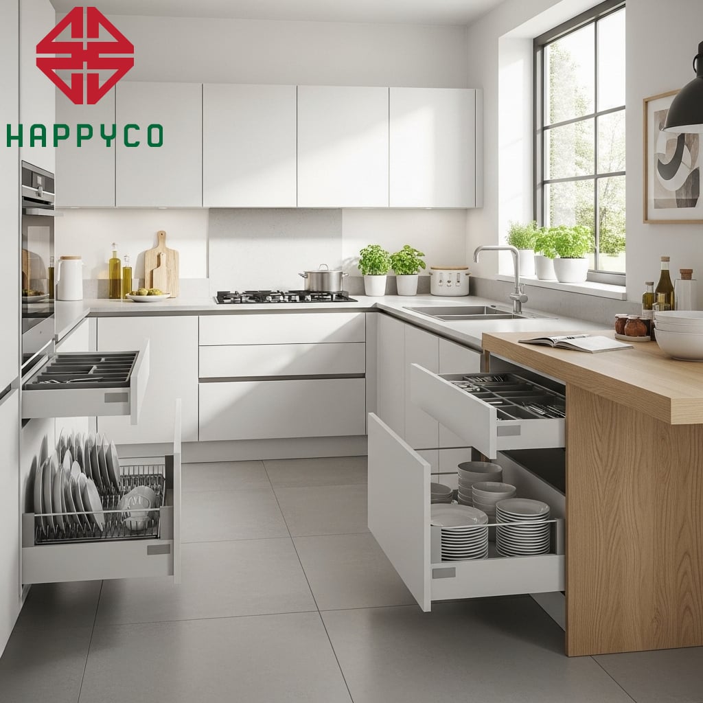 Đẳng cấp của một bộ tủ bếp nằm ở những thứ bạn không nhìn thấy ngay lập tức. Đó là sự vận hành êm ái của các hệ phụ kiện ngũ kim từ các đối tác chiến lược như Ngũ Kim Đại Thịnh.
