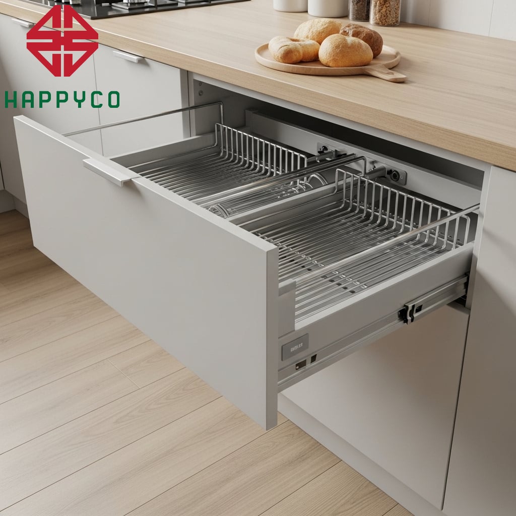 Tối ưu hóa không gian lưu trữ: Giá bát nâng hạ, kệ góc liên hoàn hay hệ tủ kho hiện đại giúp tận dụng mọi "góc chết", biến những khoang tủ sâu thẳm trở nên dễ dàng tiếp cận và đầy cảm hứng.