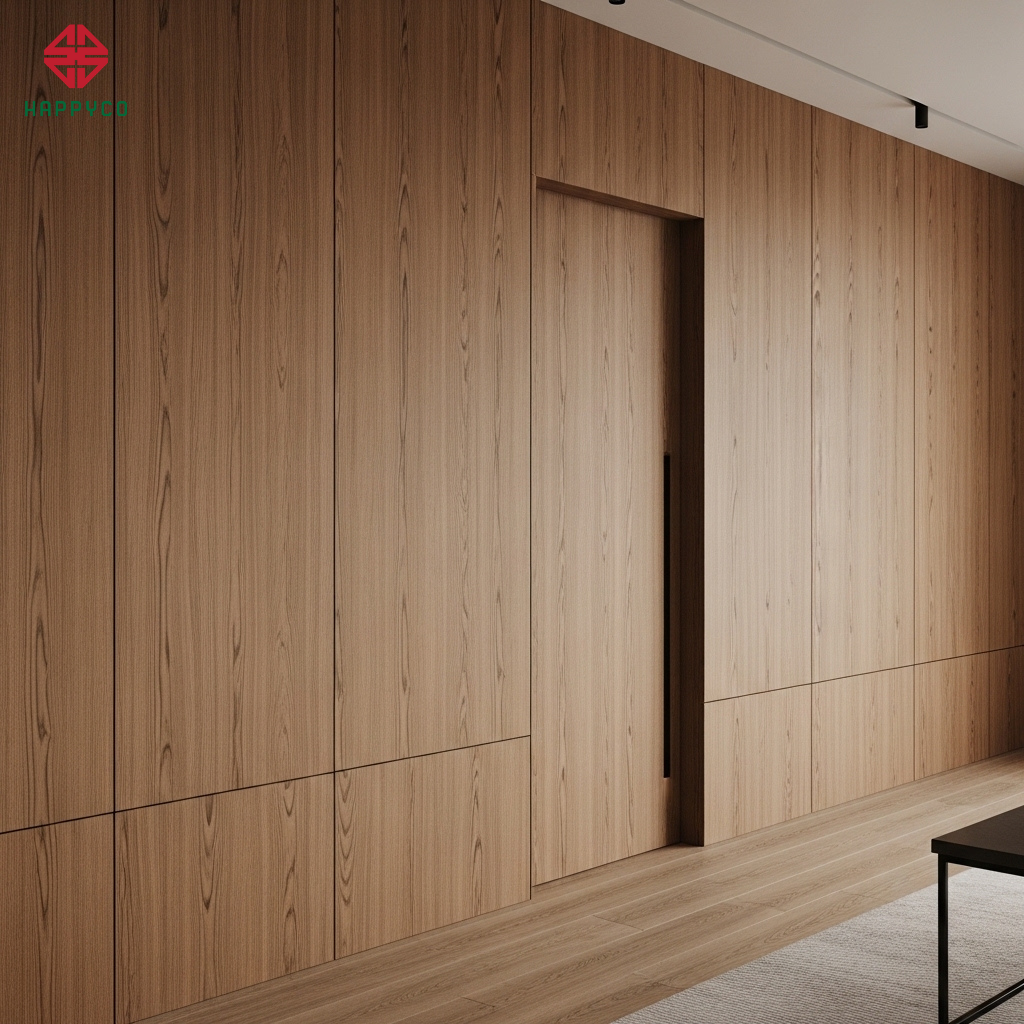 Kỹ thuật chọn lọc: Tại xưởng của Happy Décor, chúng tôi đánh dấu thứ tự các tấm Veneer hoặc Melamine được lạng từ cùng một thân cây. Khi thi công vách và cửa, thợ mộc sẽ ghép đúng thứ tự đó.