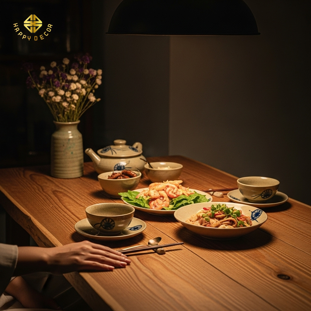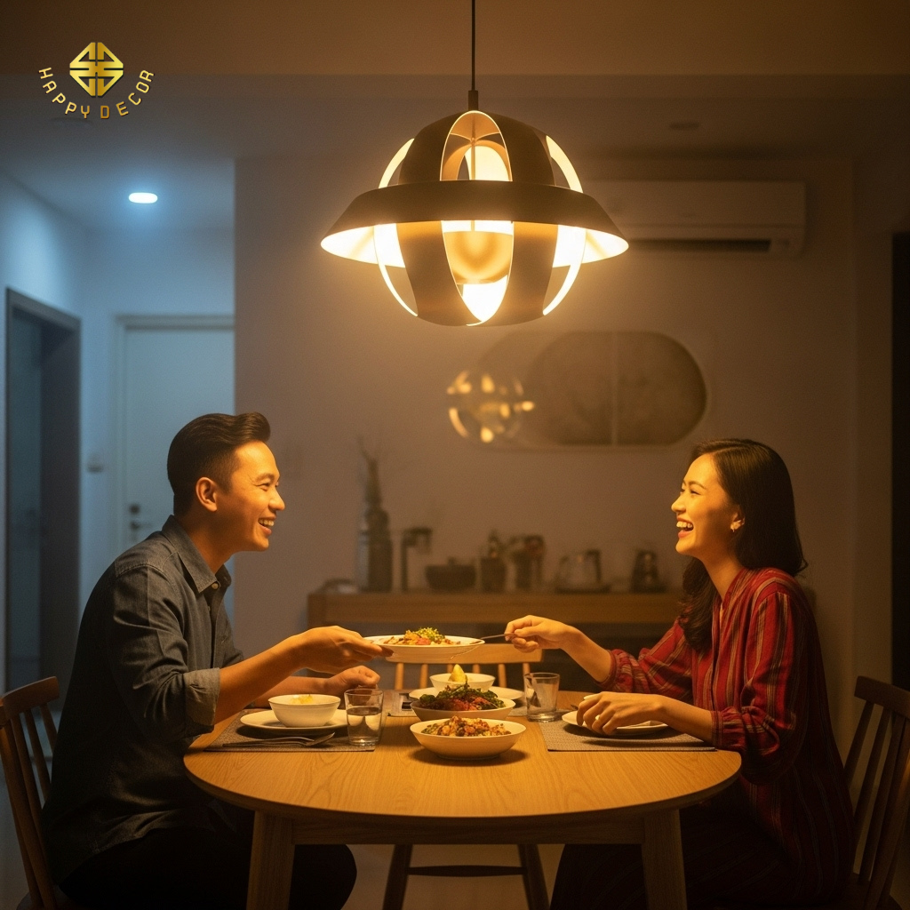 | Ánh sáng vàng ấm (2700K - 3000K) | Đèn thả ngay tâm bàn ăn | Tạo ra một "ốc đảo" riêng biệt. Ánh sáng này làm món ăn trông ngon hơn và gương mặt đối phương trở nên mềm mại, quyến rũ hơn. |
