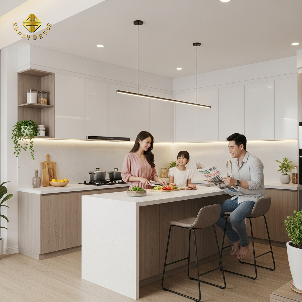 | Ánh sáng trắng (5000K) | Dưới gầm tủ bếp (Led dây) | Giúp người vợ nấu ăn chính xác, an toàn và sạch sẽ. |