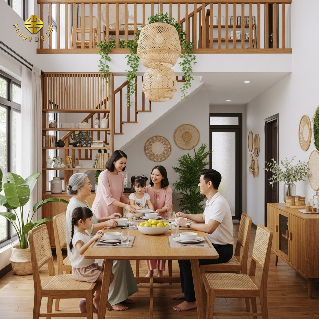 Vật liệu có nhiệt cảm. Một mặt bàn bằng gỗ tự nhiên (như Gỗ Sồi hoặc Gỗ Óc Chó) mang lại cảm giác ấm áp khi chạm tay vào. Ngược lại, mặt bàn bằng kính hoặc đá nhân tạo dù sạch nhưng lại "đuổi" người ta đi nhanh hơn sau khi ăn xong. Nếu bạn đã lỡ làm bàn đá, hãy dùng những tấm placemat bằng vải hoặc mây tre đan để làm mềm không gian.