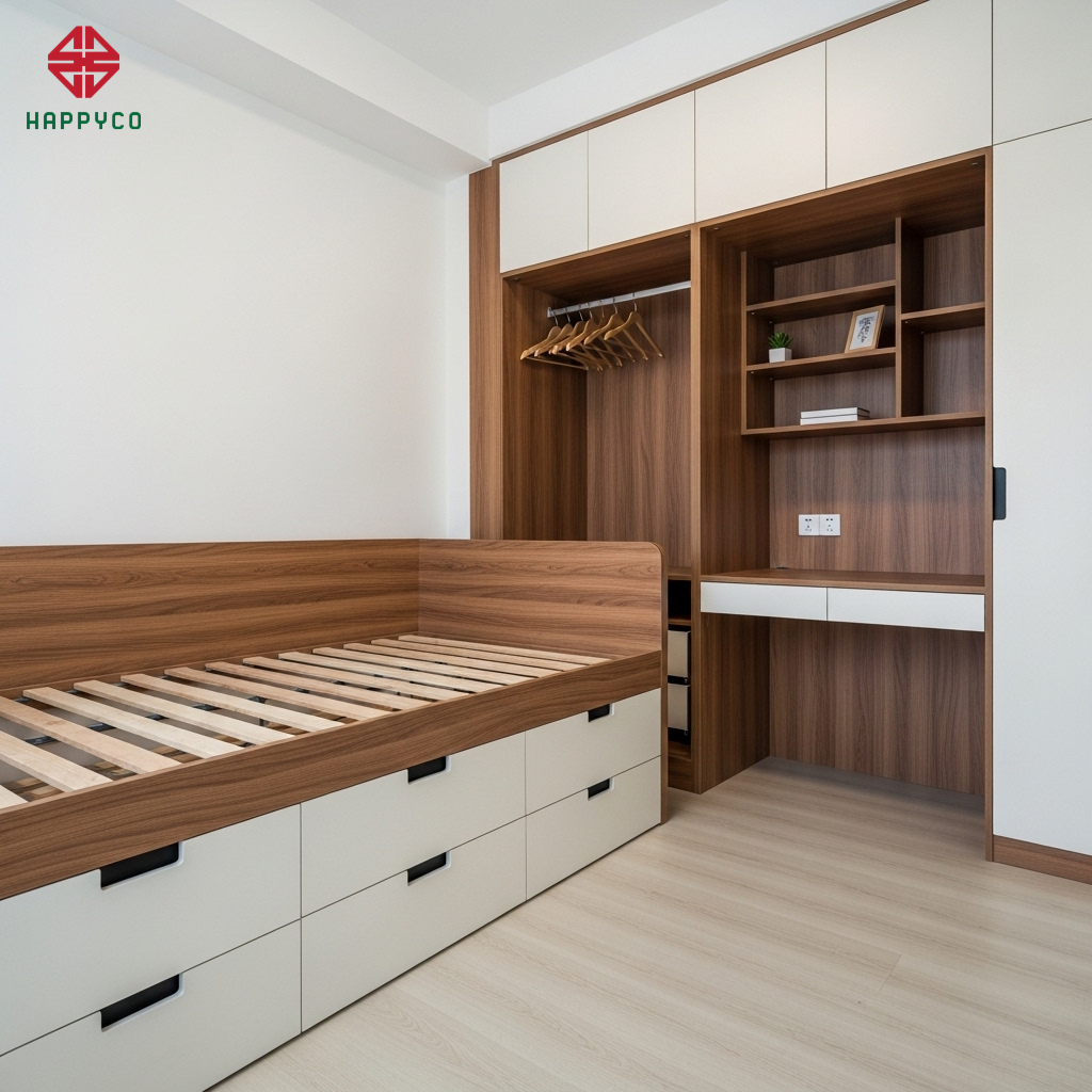 Tích hợp thông minh: Happyco thiết kế các mẫu giường ngủ tích hợp ngăn kéo đựng đồ, hay bàn làm việc liền kề tủ quần áo. Việc kết hợp này giúp giảm số lượng món đồ cần mua, từ đó trực tiếp cắt giảm ngân sách đầu tư ban đầu.