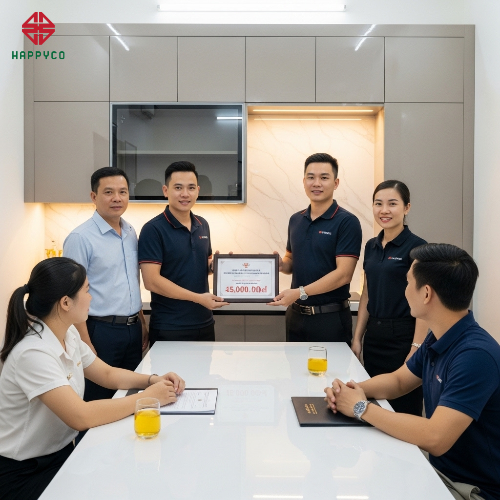 Minh bạch và cam kết: Chúng tôi báo giá trọn gói và cam kết không phát sinh. Hình ảnh thi công thực tế tại công trình chính là câu trả lời cho việc: Tại sao khách hàng thông thái luôn chọn Happyco để tối ưu tài chính.