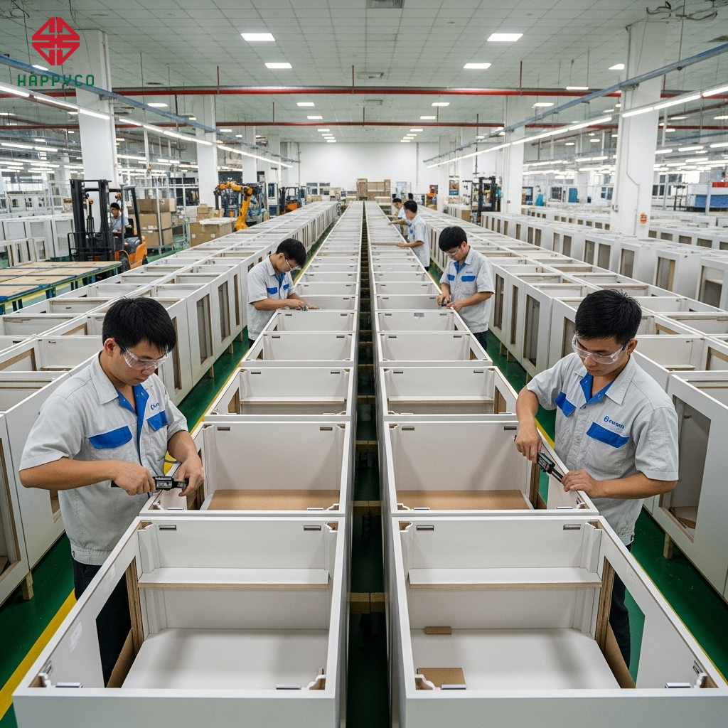 Quy trình sản xuất hiện đại: Happyco áp dụng sản xuất theo Module, giúp tối ưu hóa phôi gỗ và giảm thiểu nhân công lắp ráp thủ công. Việc này không chỉ giúp giá thành sản phẩm giảm xuống mà còn đảm bảo mọi sản phẩm đều có độ chính xác tuyệt đối.