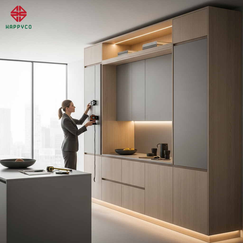 Thi công nội thất là một bài toán về độ chính xác. Chỉ cần một sai lệch nhỏ ở góc tường cũng có thể làm hỏng toàn bộ hệ tủ lớn.