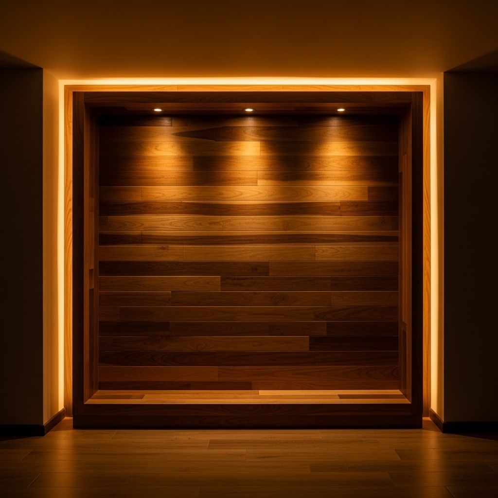 Hiệu ứng tâm lý: Khi ánh sáng mạnh tập trung vào các "điểm phủ" gỗ thật, những phần nội thất tiết kiệm nằm ở góc khuất hoặc phía dưới sẽ bị lu mờ vào bóng tối. Bộ não con người sẽ tự động "điền vào chỗ trống" và mặc định rằng toàn bộ căn phòng đều là những loại gỗ cao cấp nhất. Đây là đỉnh cao của việc tối ưu ngân sách mà vẫn đạt được sự mãn nhãn tuyệt đối.