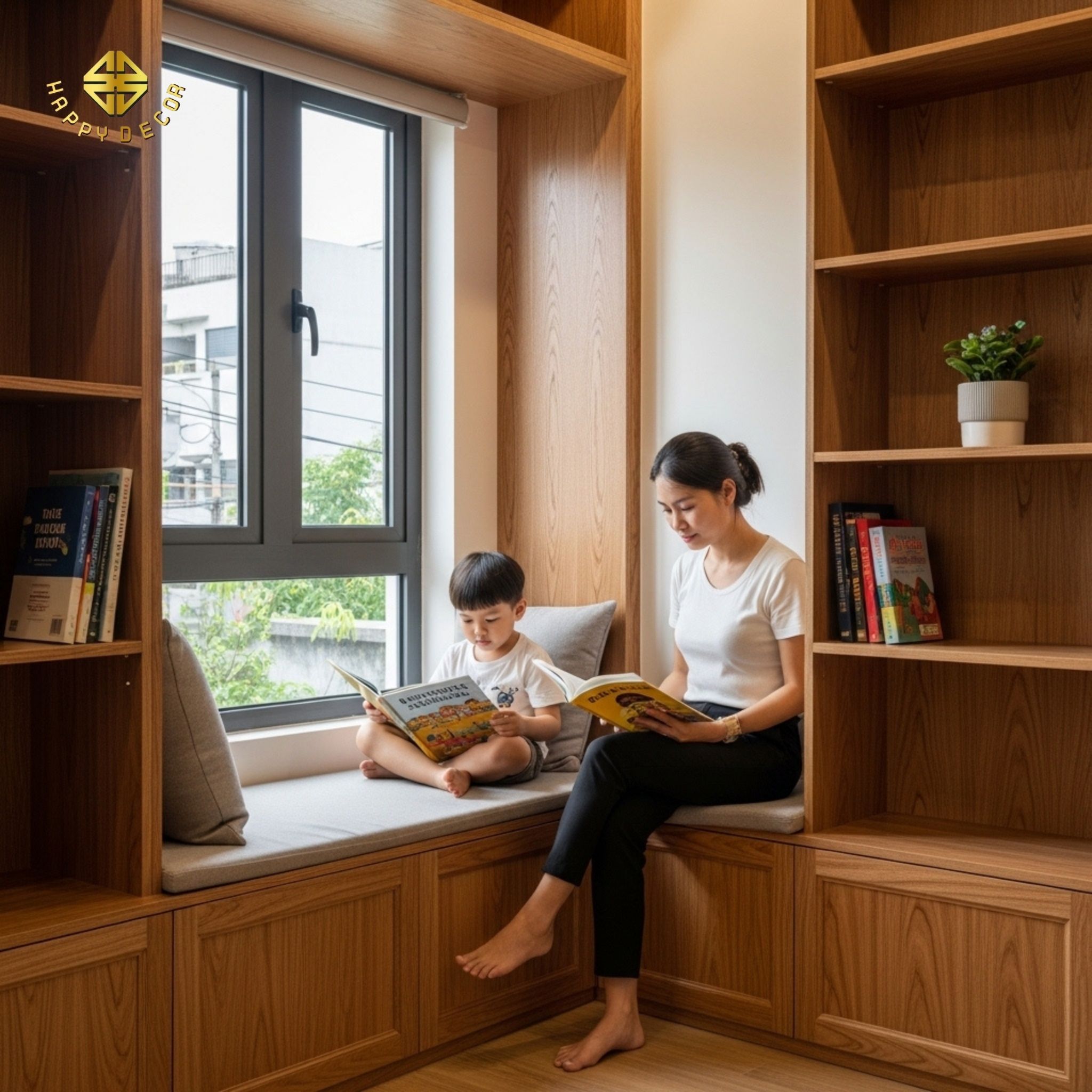Tạo Khu Vực Đọc Sách/Trò Chuyện: Tích hợp một góc nhỏ trong phòng khách hoặc phòng sinh hoạt chung làm "Thư viện mini." Sử dụng hệ kệ âm tường hoặc ghế bành thư giãn (niche seating) cạnh cửa sổ.