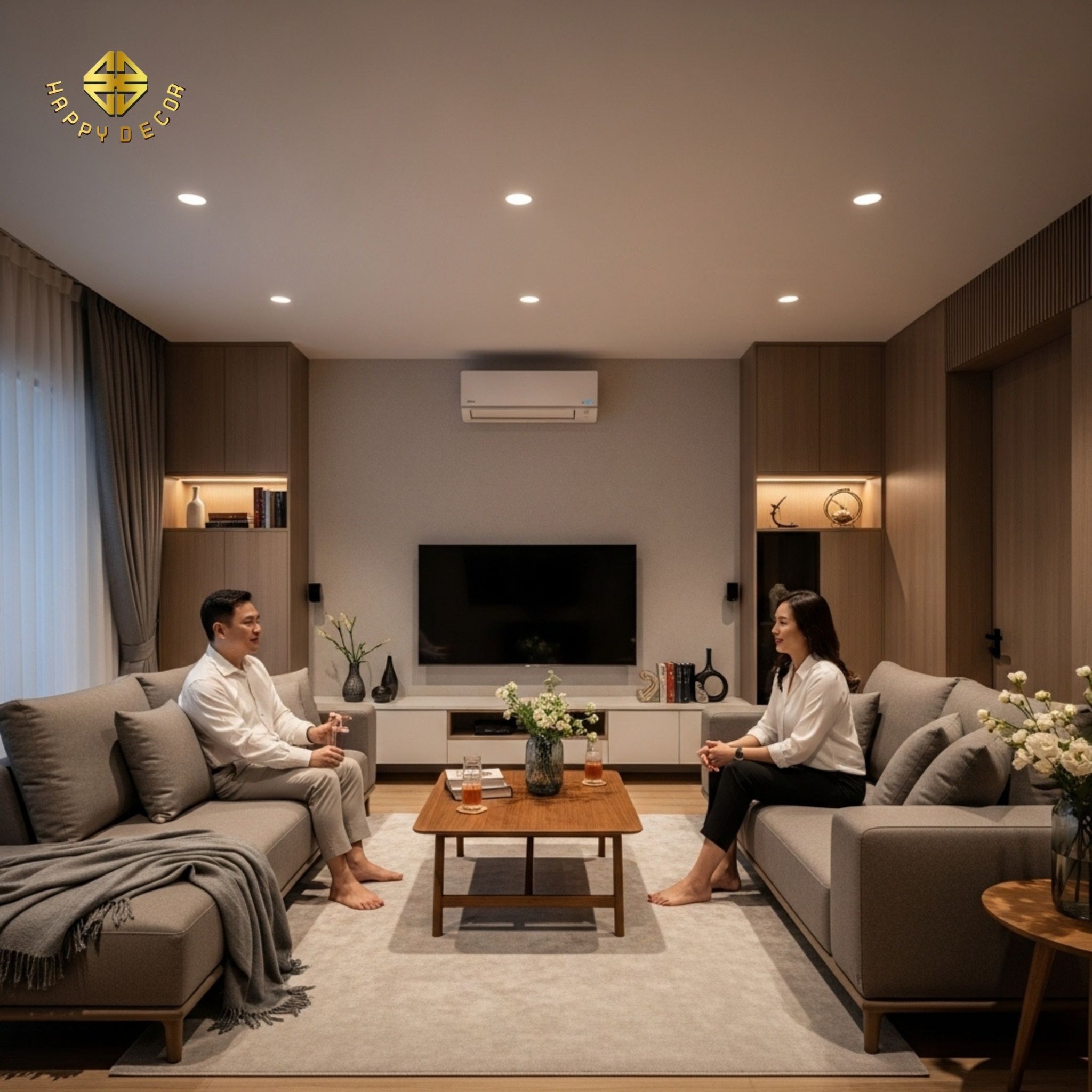 Ánh Sáng & Chất Liệu: Sử dụng ánh sáng ấm áp, dễ chịu cho khu vực phòng khách. Ưu tiên các chất liệu gỗ tự nhiên hoặc gỗ công nghiệp có vân gỗ chân thật (kiến thức mộc) để mang lại cảm giác ấm cúng, thân thiện và gần gũi.