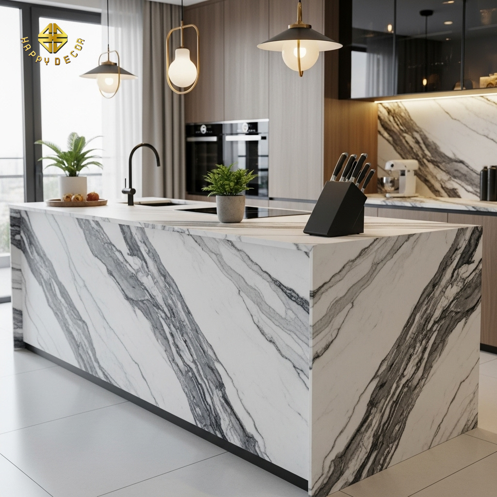 Khổ đá khổng lồ và siêu mỏng: Bạn có tưởng tượng được một tấm đá lớn $3.2\text{m} \times 1.6\text{m}$ nhưng chỉ dày có $6\text{mm}$? Nó cho phép kiến trúc sư ốp toàn bộ mảng tường phòng khách hoặc cánh tủ bếp mà không cần bất kỳ đường nối (line) nào, tạo nên một sự liền mạch cực kỳ đẳng cấp.