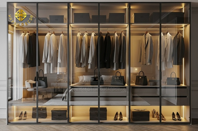 Sự xuyên thấu (Kính): Dùng cánh kính khung nhôm cho hệ tủ rượu và tủ quần áo.