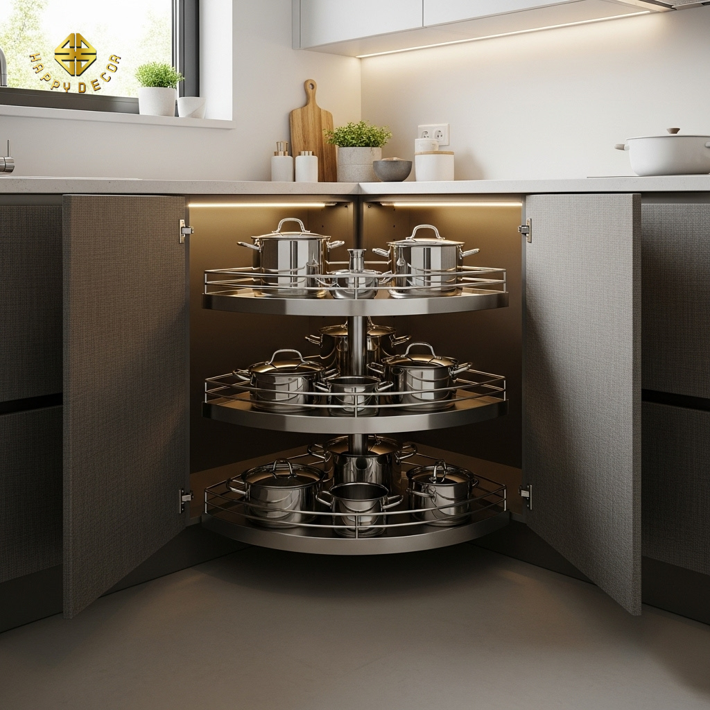 Trong thiết kế nội thất bếp, "góc chết" (góc chữ L hoặc chữ U) luôn là bài toán đau đầu nhất. Đây là nơi có diện tích rất lớn nhưng lại cực kỳ khó tiếp cận; nếu chỉ làm đợt gỗ thông thường, bạn phải bò hẳn vào trong mới lấy được đồ, dẫn đến việc nơi này trở thành "nghĩa địa" chứa rác hoặc những món đồ bị lãng quên.