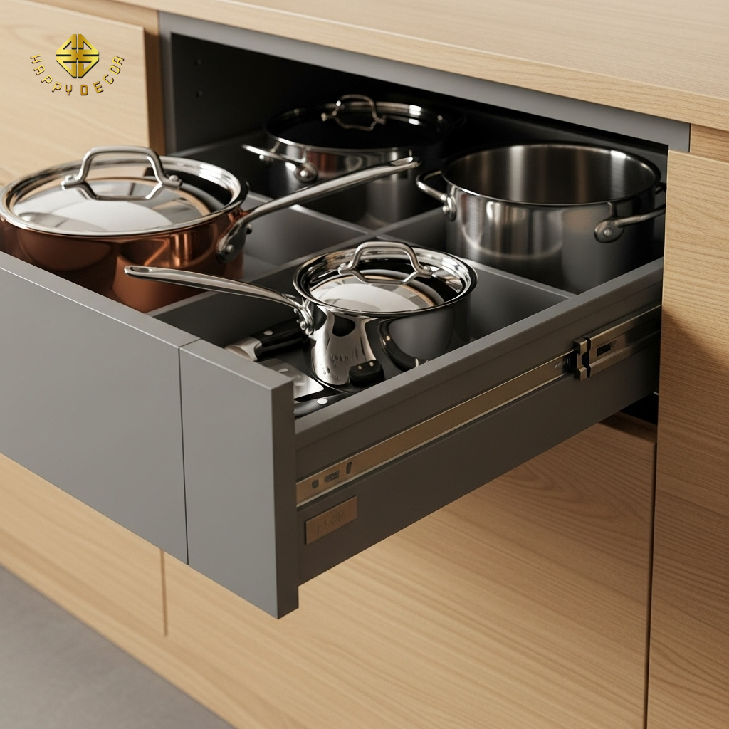Tính ứng dụng: Đây là nơi lý tưởng để chứa các loại thìa, dĩa, dụng cụ làm bánh hoặc gia vị khô. Giải pháp này giúp mặt đứng của tủ bếp đồng bộ hoàn toàn với các ngăn kéo khác, tạo nên một vẻ đẹp tối giản và liền mạch.