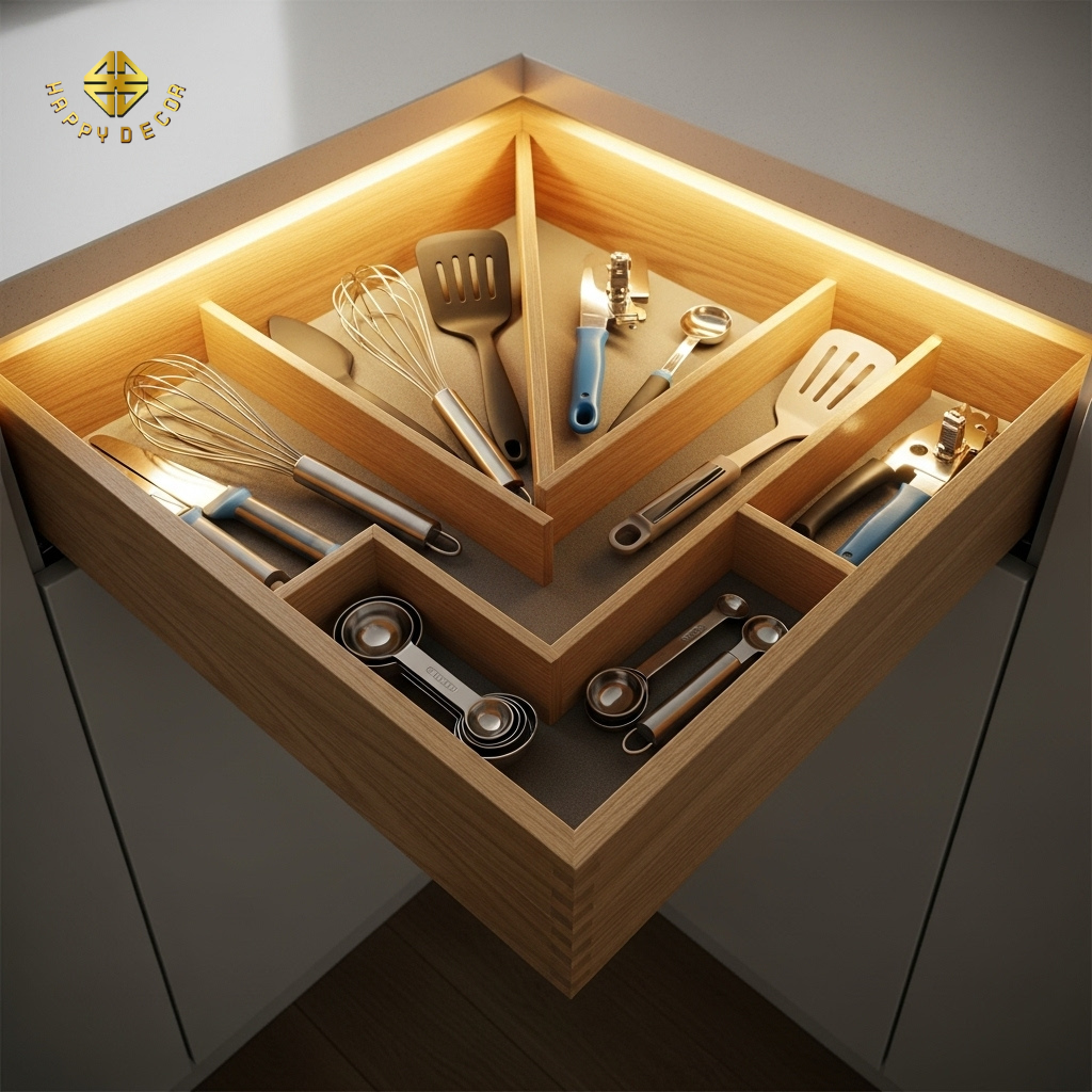3. Ngăn kéo góc chữ V – Giải pháp mộc truyền thống nhưng sáng tạo