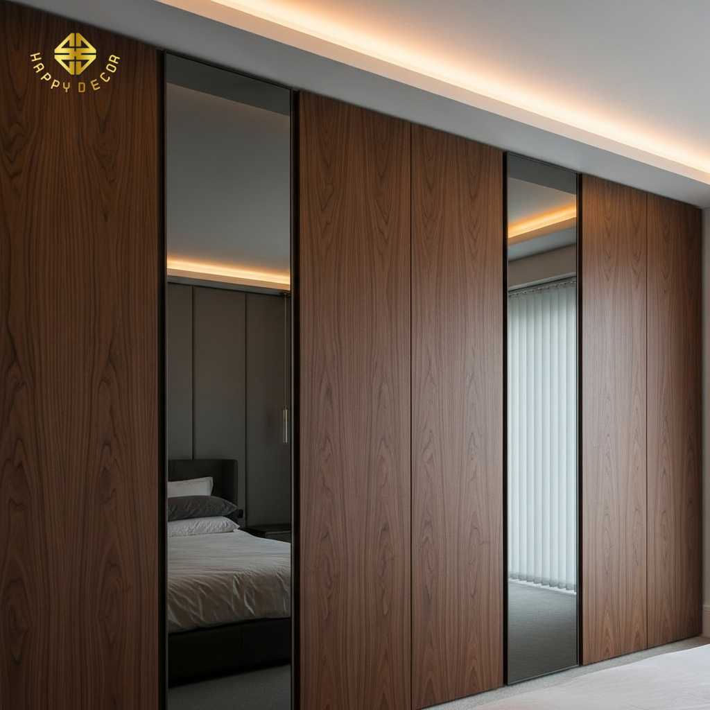 Giải pháp thi công: Happy Décor ưu tiên thiết kế gương ở mặt trong cánh tủ áo. Khi cần soi, bạn chỉ cần mở cánh tủ; khi đóng lại, năng lượng trong phòng sẽ hoàn toàn tĩnh lặng. Nếu bắt buộc phải để gương bên ngoài, chúng tôi sẽ sử dụng hệ rèm che hoặc thiết kế dạng gương xoay 180 độ để gia chủ chủ động che chắn khi đi ngủ.