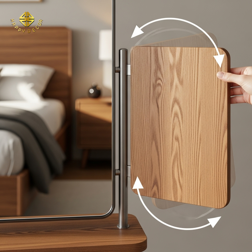 Nẹp chỉ đồng trang trí: Để giảm bớt tính sát khí của gương, các nghệ nhân mộc tại Happy Décor thường kết hợp thêm các đường nẹp đồng hoặc nẹp gỗ nhỏ chia ô trên bề mặt gương. Điều này không chỉ làm tăng tính nghệ thuật mà còn có tác dụng "phân tán" năng lượng phản chiếu quá mạnh, giúp không gian phòng ngủ trở nên hiền hòa và an yên hơn.