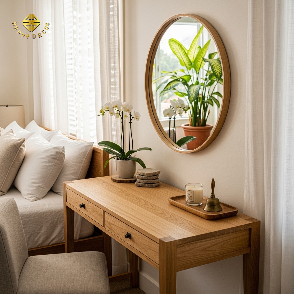 Kỹ thuật bố trí: Tốt nhất là đặt bàn trang điểm song song với giường ngủ hoặc tựa vào bức tường cạnh cửa sổ để đón ánh sáng tự nhiên. Happy Décor thường sử dụng cốt gỗ nhựa chống ẩm cao cấp cho khu vực này để tránh việc hơi ẩm từ các hũ mỹ phẩm làm bong tróc bề mặt gỗ theo thời gian.