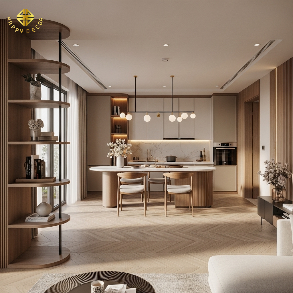 Phòng khách "Tụ tài": Chúng tôi ưu tiên các hệ kệ tivi bo tròn Radius, sử dụng màu sắc trung tính từ bảng màu Kho Mộc để tạo cảm giác vững chãi, bình an, giúp gia chủ luôn minh mẫn và đón nhận nhiều cơ hội kinh doanh tại thủ phủ công nghiệp Đồng Nai.