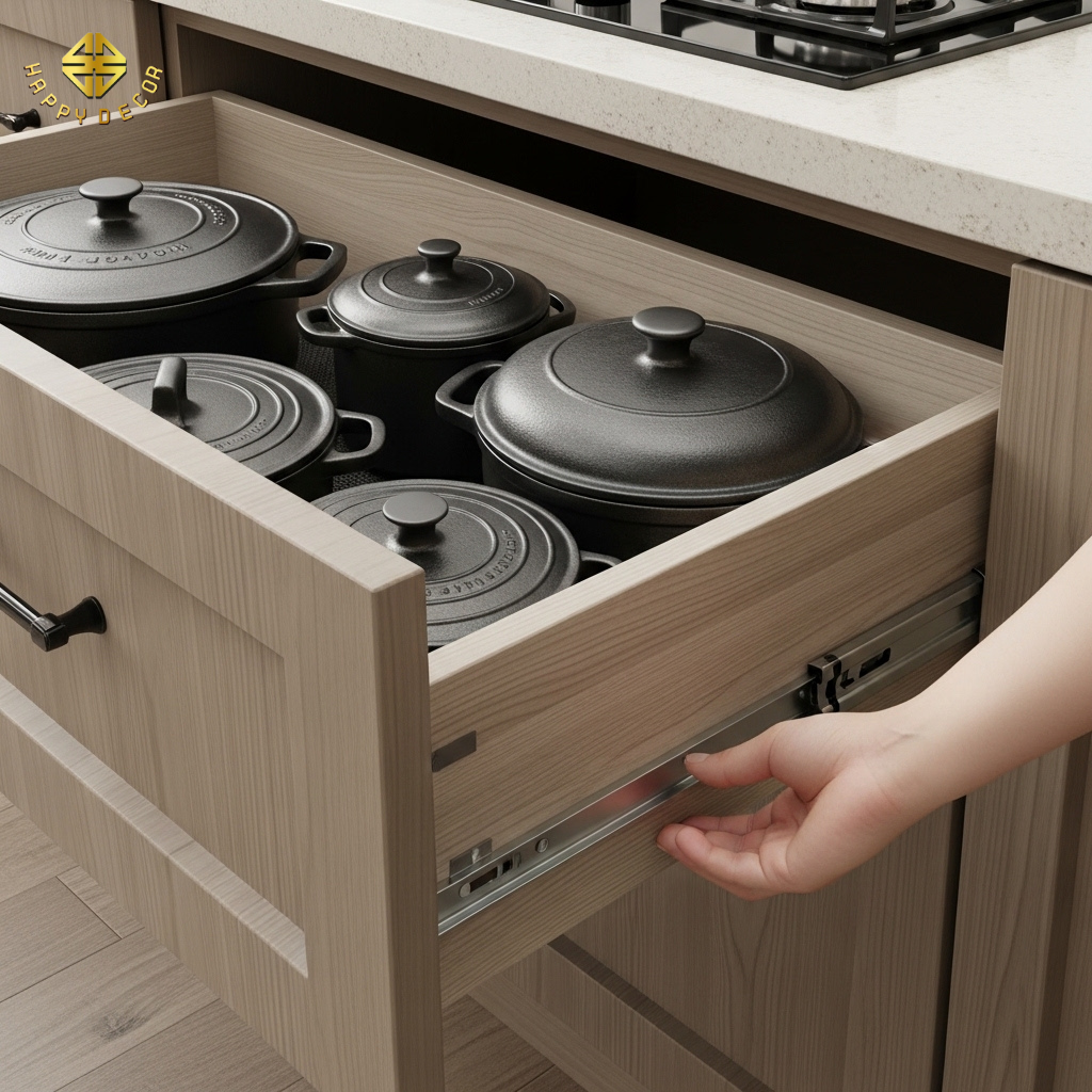 Một bộ tủ bếp đẹp nhưng ray trượt kẹt cứng hay bản lề gỉ sét sẽ là một thảm họa về trải nghiệm. Tại Happy Décor, chúng tôi coi phụ kiện là linh hồn của nội thất.