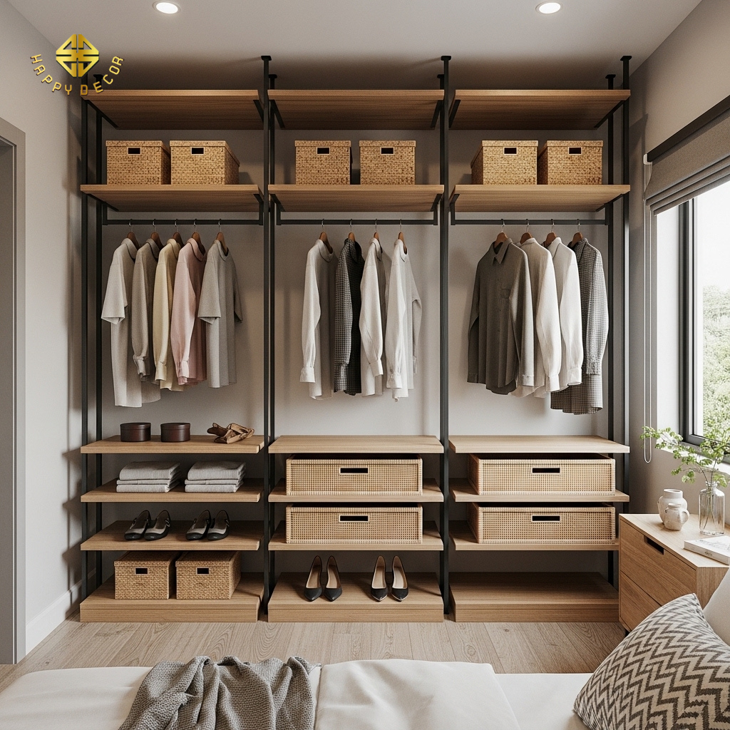 Tư duy logic: Việc này giúp giảm 30% diện tích gỗ cần dùng. Các ngăn kéo gỗ được thay thế một phần bằng các giỏ mây tre đan hoặc hộp nhựa cao cấp, vừa tạo điểm nhấn decor sinh động, vừa giúp việc lưu trữ trở nên linh hoạt hơn theo nhu cầu sử dụng.