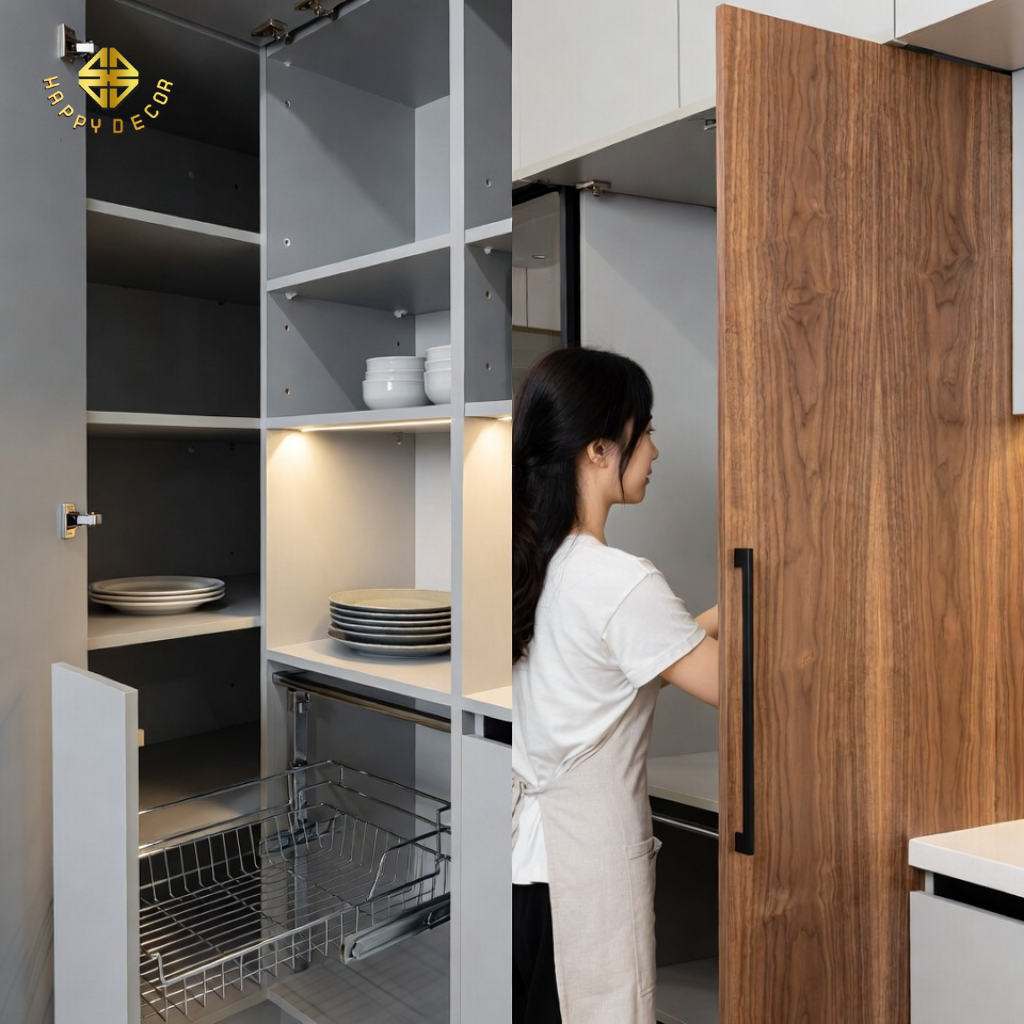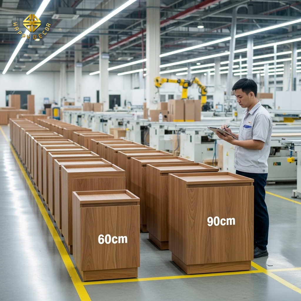 Kỹ thuật sản xuất: Happy Décor thiết kế các "Module lõi" cho tủ bếp, tủ quần áo theo các kích thước tiêu chuẩn (60cm, 90cm,120cm). Việc sản xuất hàng loạt các Module này tại xưởng giúp giảm 50% thời gian thi công và 30% lãng phí vật tư.