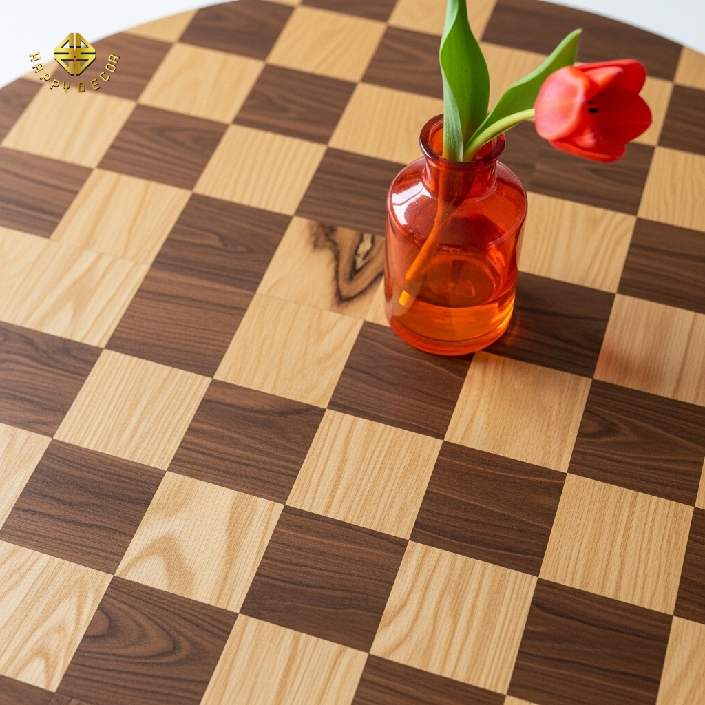Họa tiết bàn cờ (Checkerboard) là linh hồn của Avant-Basic. Nhưng thay vì dùng gạch men lạnh lẽo, Happy Décor đưa kỹ thuật này vào khảm gỗ (Marquetry).