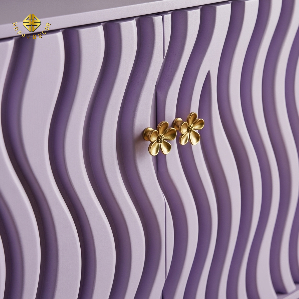 Kỹ thuật thi công: Happy Décor sử dụng công nghệ Plywood uốn cong đa lớp và máy cắt CNC 5 trục để tạo ra các hệ tủ có bề mặt lượn sóng (Wavy). Chúng tôi không chỉ làm phẳng, chúng tôi tạo ra các đường gờ nổi dạng vảy cá hoặc dợn sóng trên cánh tủ gỗ, sau đó xử lý sơn bệt mịn màng để tạo hiệu ứng thị giác 3D cực mạnh.