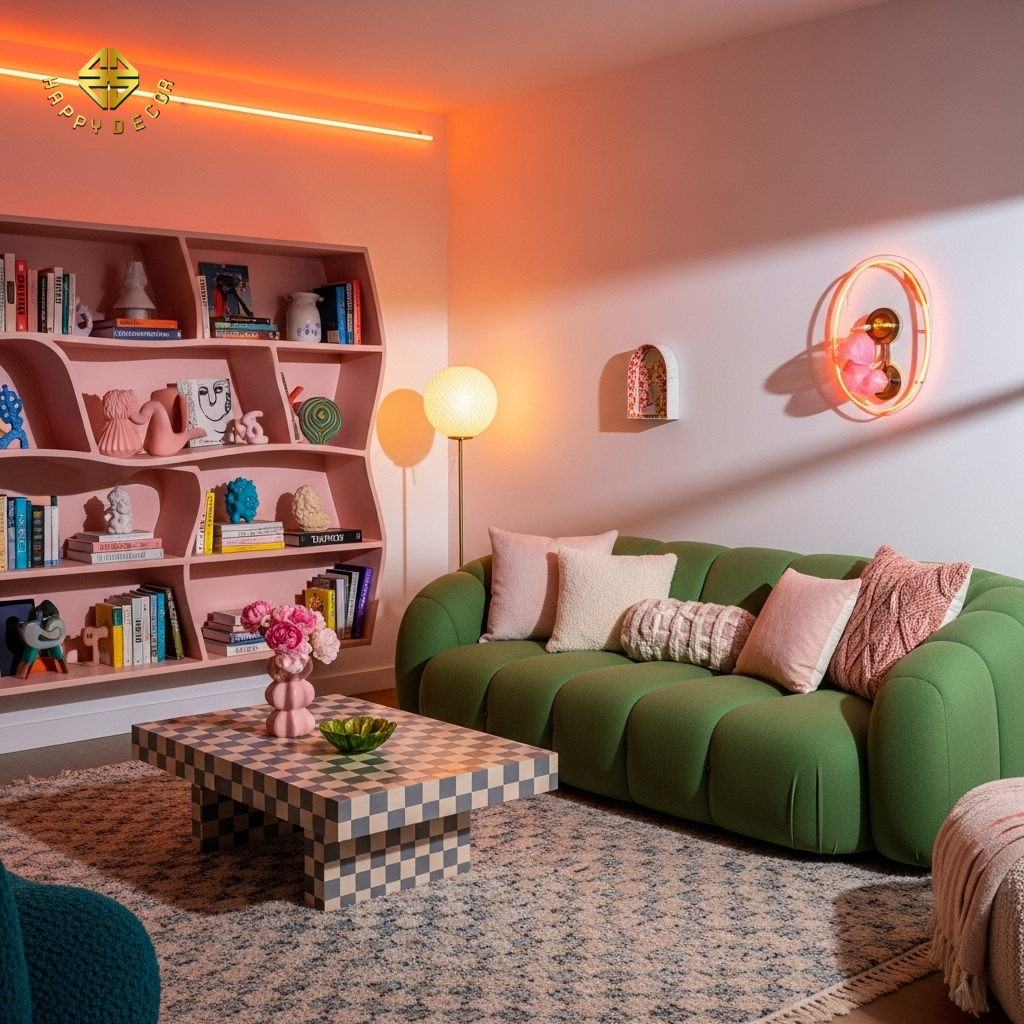 Tư duy sắp đặt: Đừng sợ sự lộn xộn. Một chiếc tủ gỗ cao cấp đặt cạnh một chiếc đèn nấm bằng nhựa màu cam, phía trên là những món đồ chơi nghệ thuật (Art Toys) đắt đỏ. Chính sự pha trộn giữa "cao cấp" và "vui nhộn" này tạo nên cái tôi khác biệt của gia chủ Happy Décor.