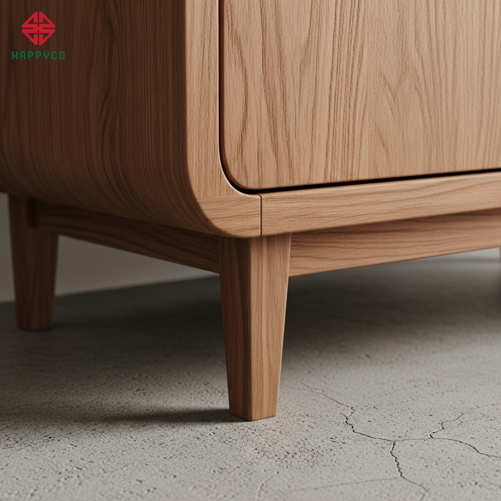 Thi công bo góc nghệ thuật: Happyco sử dụng kỹ thuật uốn ván và xử lý cạnh tinh xảo để tạo ra các hệ tủ, vách tường có đường cong mượt mà. Sự khít khao trong các điểm giao nhau giữa đường cong và mặt phẳng chính là bảo chứng cho tay nghề thợ bậc thầy của chúng tôi.