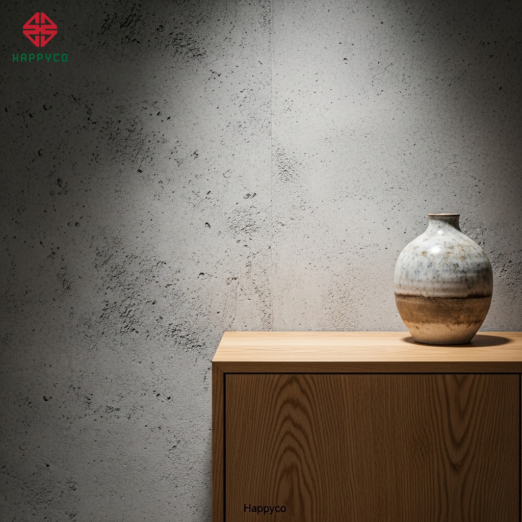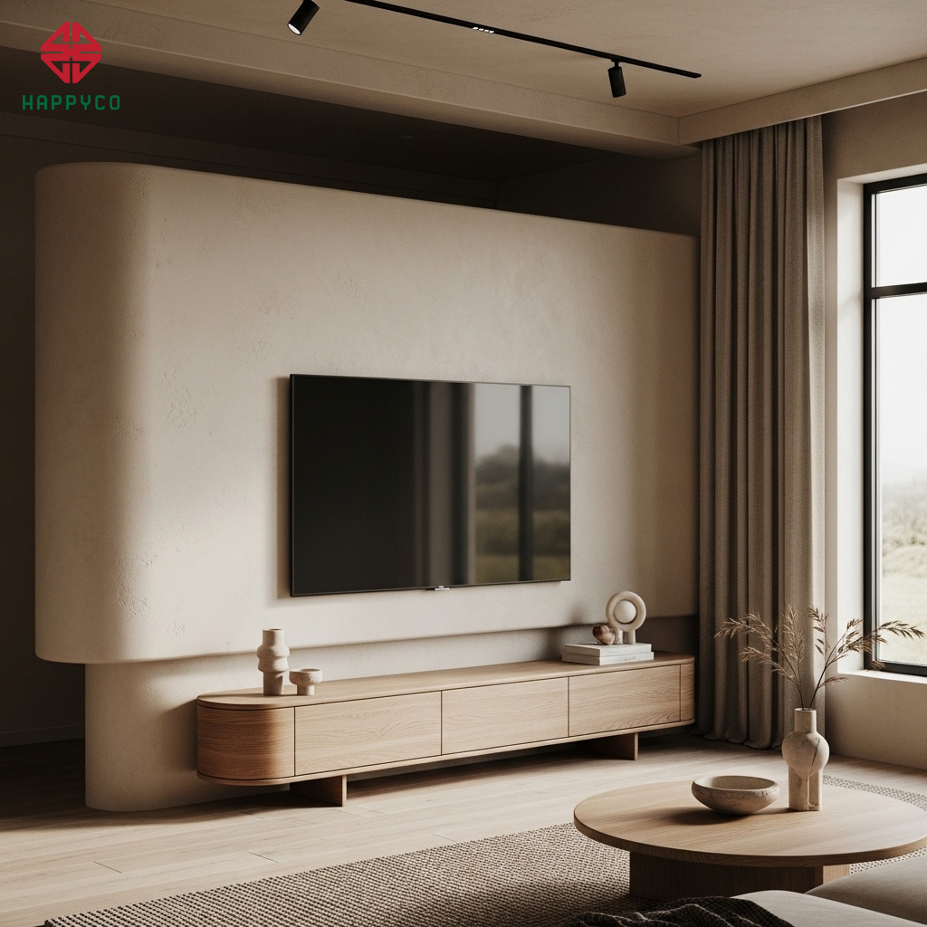 Sơn hiệu ứng và Gỗ sồi mờ: Happyco ưu tiên các dòng ván gỗ có bề mặt vân sâu, kết hợp với sơn hiệu ứng đất sét hoặc bê tông nhám nhẹ. Chúng tôi kiểm soát độ bóng của vật liệu ở mức thấp nhất để tôn vinh vẻ đẹp chân thực, mộc mạc nhưng cực kỳ sang trọng.