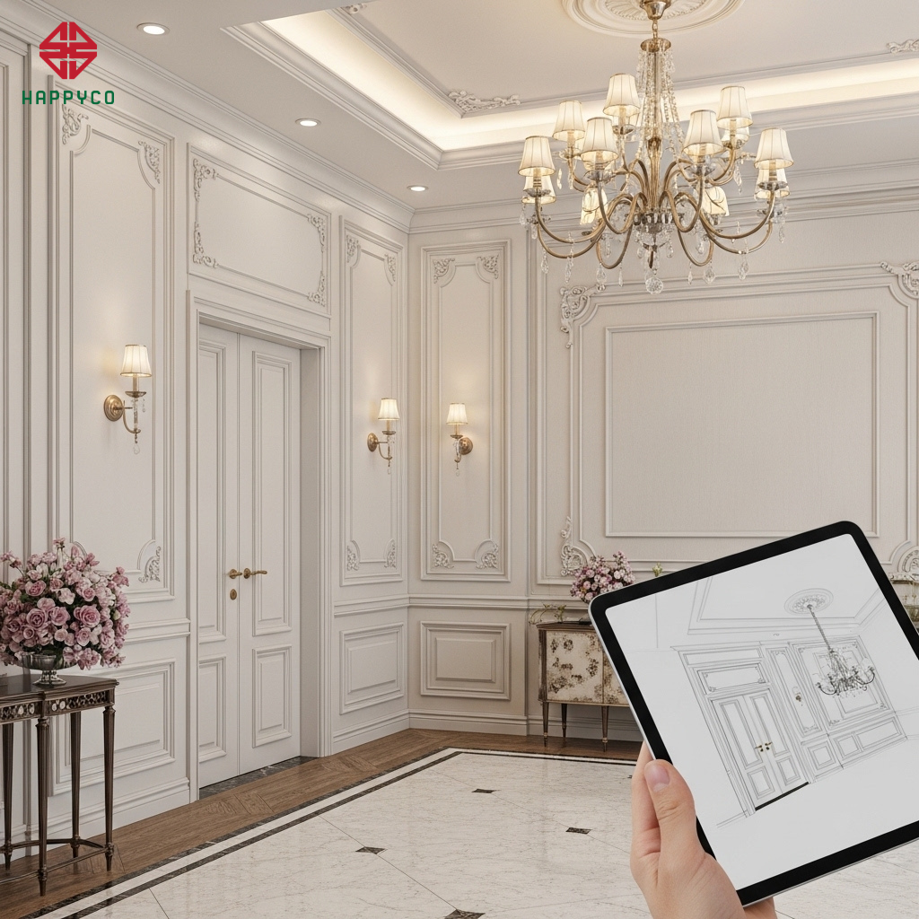 Điểm nhấn phào chỉ: Thay vì dùng phào thạch cao dễ nứt, Happy Décor ưu tiên phào nhựa PU cao cấp hoặc phào gỗ tự nhiên được chạy CNC tinh xảo. Những đường chỉ mảnh, sắc nét chính là "trang sức" giúp bức tường vô hồn trở nên sống động.