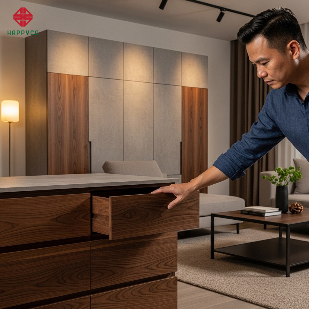 Độ chính xác tuyệt đối: Thợ mộc Happy Décor sử dụng máy cắt CNC 45 độ để xử lý các góc nối của tủ, bàn và kệ. Khi hai tấm ván ghép lại, đường line biến mất hoàn toàn, tạo nên một khối mộc vuông thành sắc cạnh, mạnh mẽ.