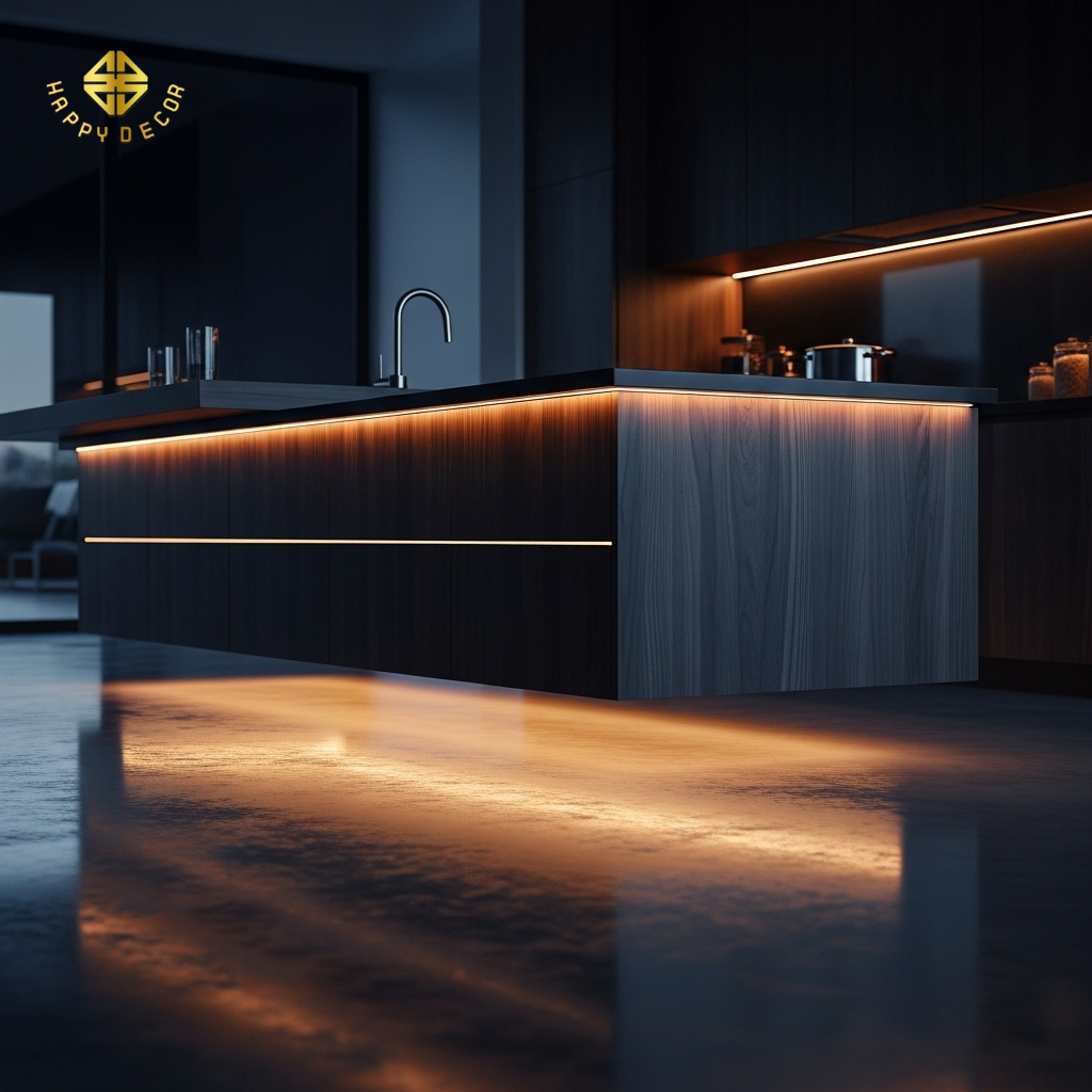 Đèn LED chân tủ: Happy Décor lắp đặt hệ thống LED dây hắt gầm phía dưới chân đảo bếp (Plinth lighting). Ánh sáng này tạo hiệu ứng "Floating Island" (đảo bay), giúp khối gỗ nặng nề trở nên thanh thoát và lung linh hơn vào buổi tối.