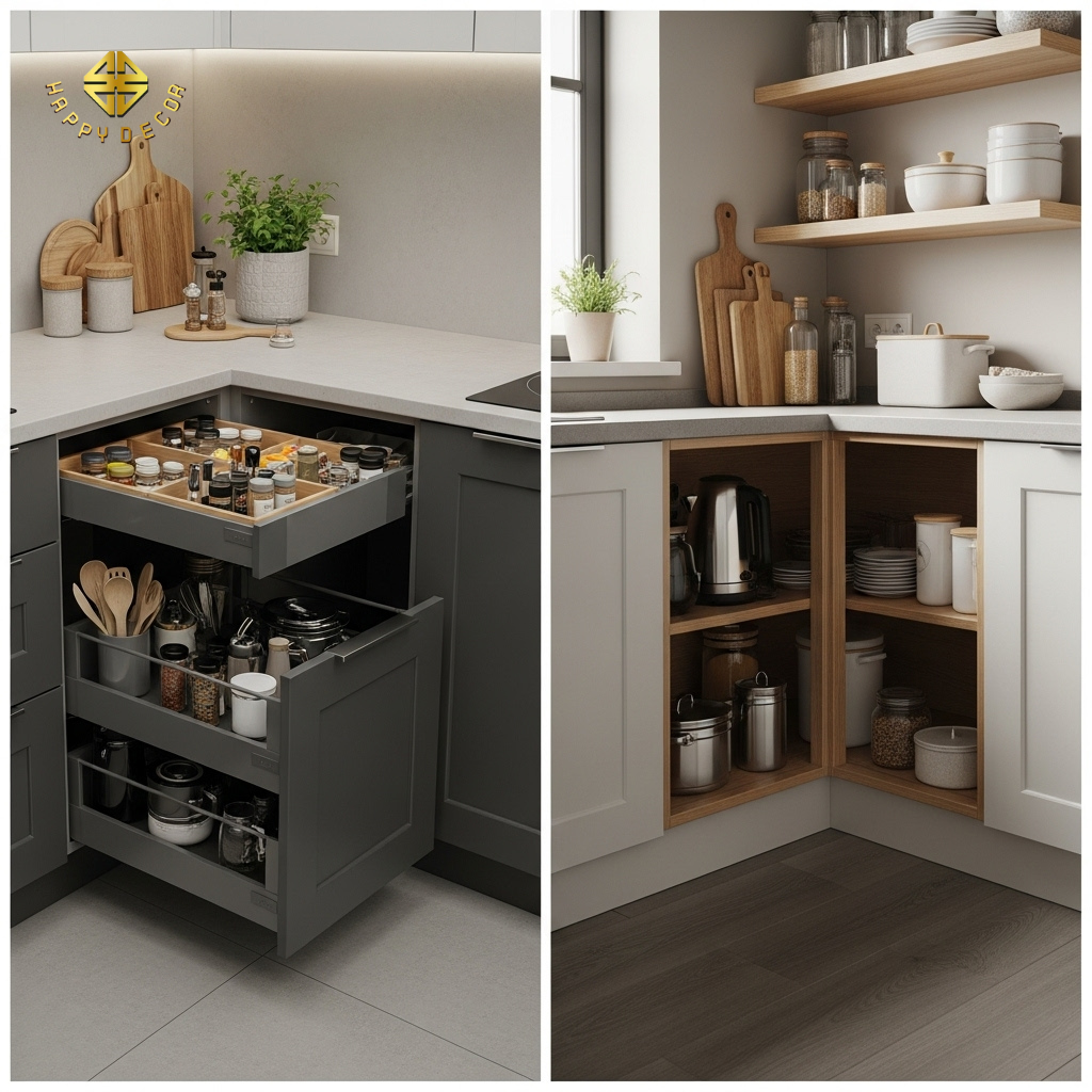Kệ góc: Nếu bếp của bạn không quá chật, hãy cân nhắc kỹ trước khi lắp kệ góc liên hoàn giá 8-10 triệu. Đôi khi chỉ cần chia đợt gỗ đơn giản và sắp xếp đồ dùng hợp lý, bạn đã tiết kiệm được một khoản tiền lớn để mua bếp từ hoặc máy hút mùi xịn hơn.