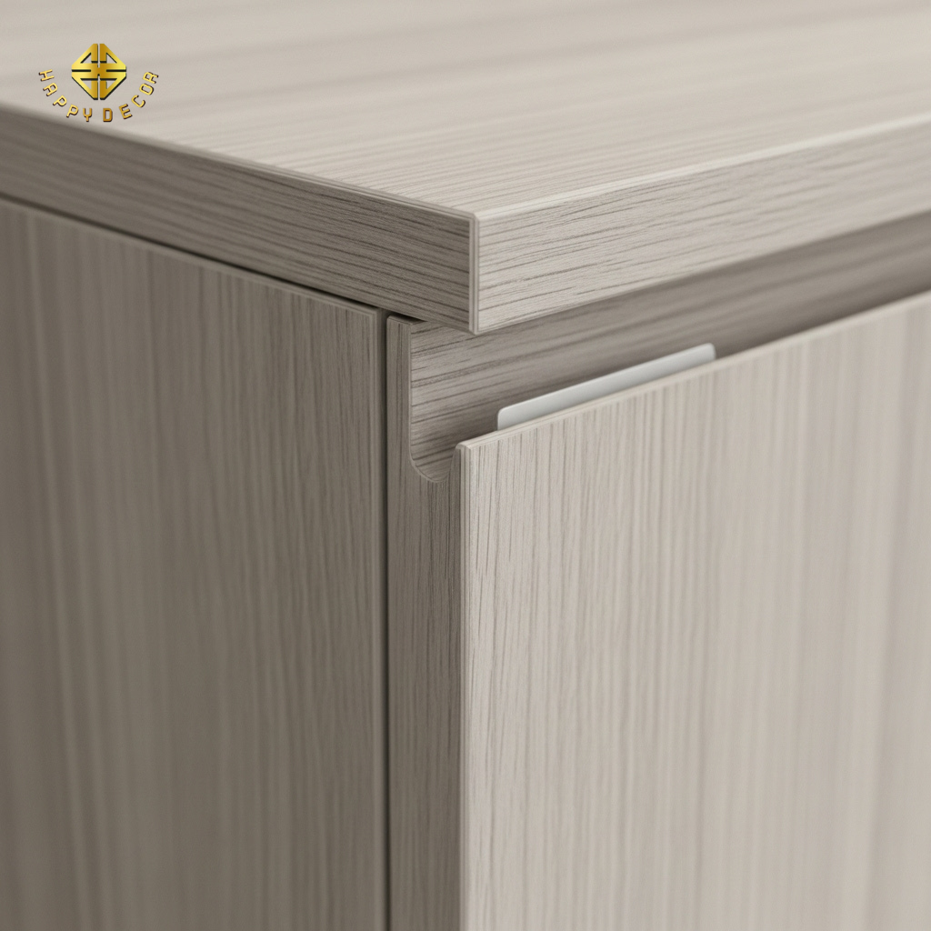 Xu hướng 2026: Để tiết kiệm và tạo vẻ tối giản (Minimalism), hãy sử dụng tay nắm âm (vát cạnh chữ J, K, U) trực tiếp trên cánh tủ gỗ.