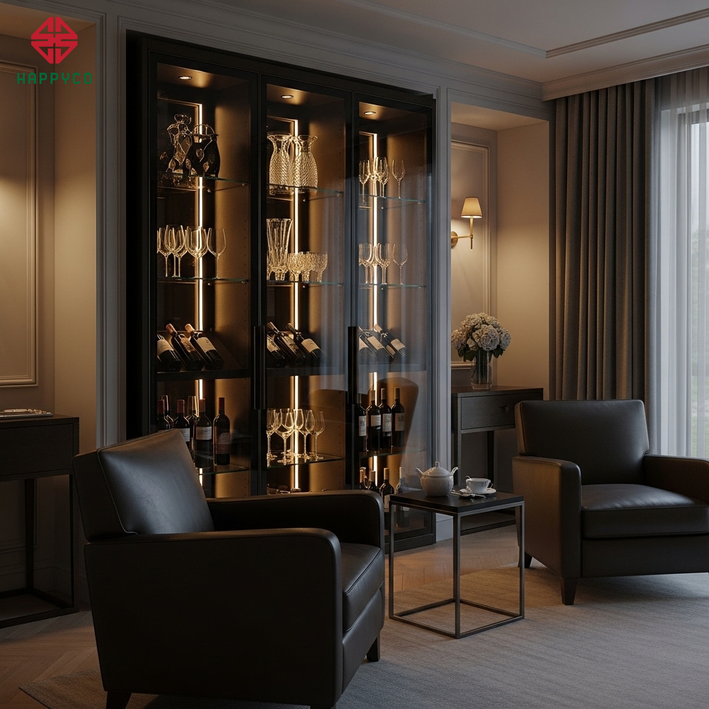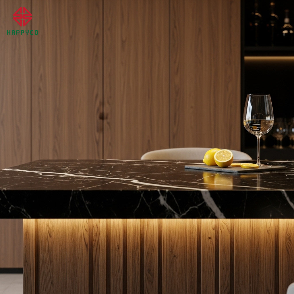 Sự kết hợp giữa nhám và bóng: Happy Décor phối hợp khéo léo giữa các bề mặt gỗ nhám mộc mạc với các chi tiết kim loại titan hoặc đá nung kết bóng gương. Sự đối lập này tạo nên sự sang trọng hiện đại, vừa ấm áp vừa lộng lẫy.