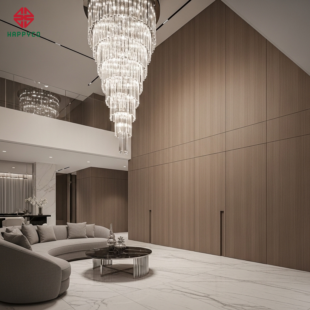 Hệ vách ốp đại sảnh: Thay vì những bức tường sơn đơn điệu, chúng tôi sử dụng các hệ vách ốp gỗ cao cấp kéo dài từ sàn lên đến trần thông tầng. Sự liền mạch này không chỉ tạo hiệu ứng thị giác mạnh mẽ mà còn giúp không gian trở nên bề thế, trang trọng.