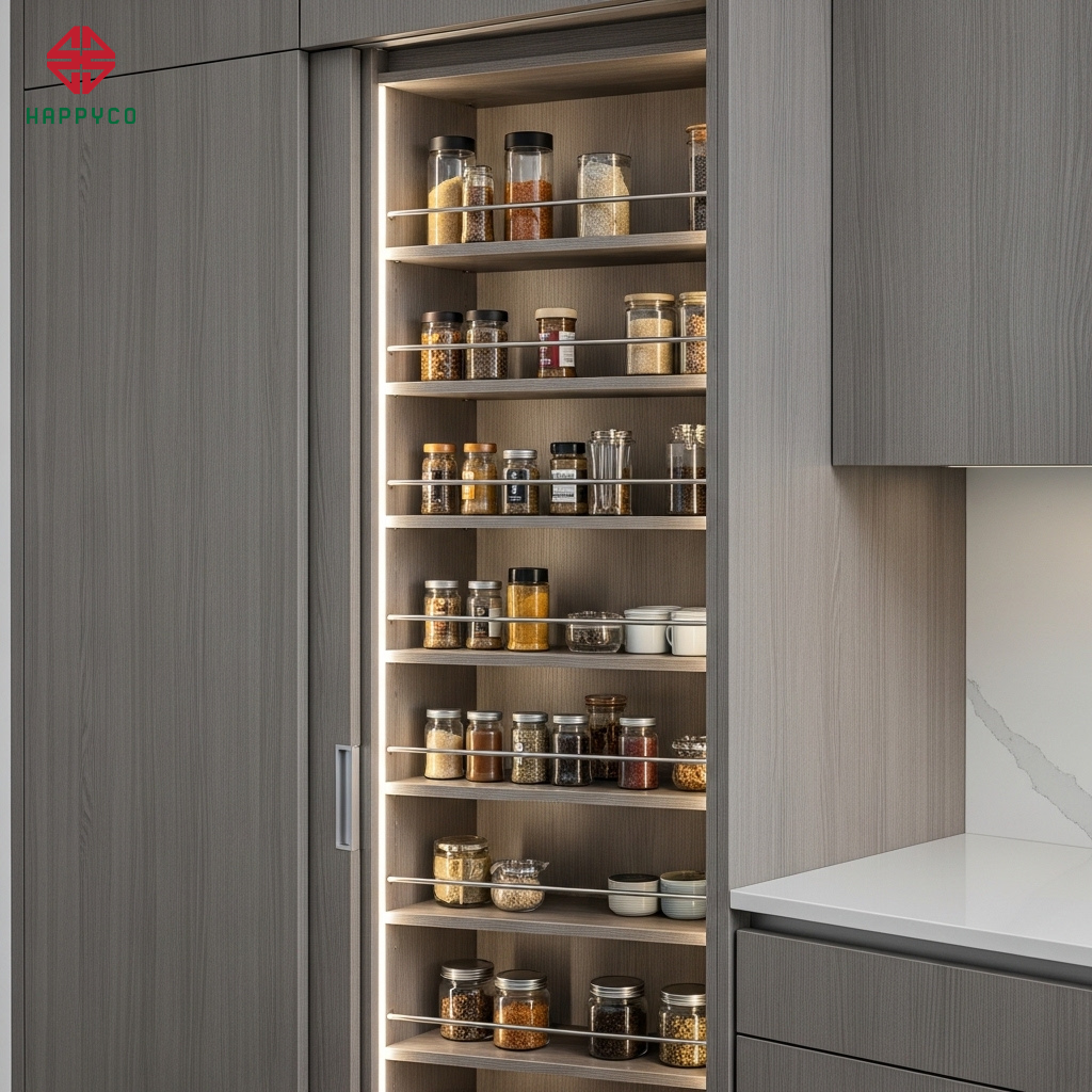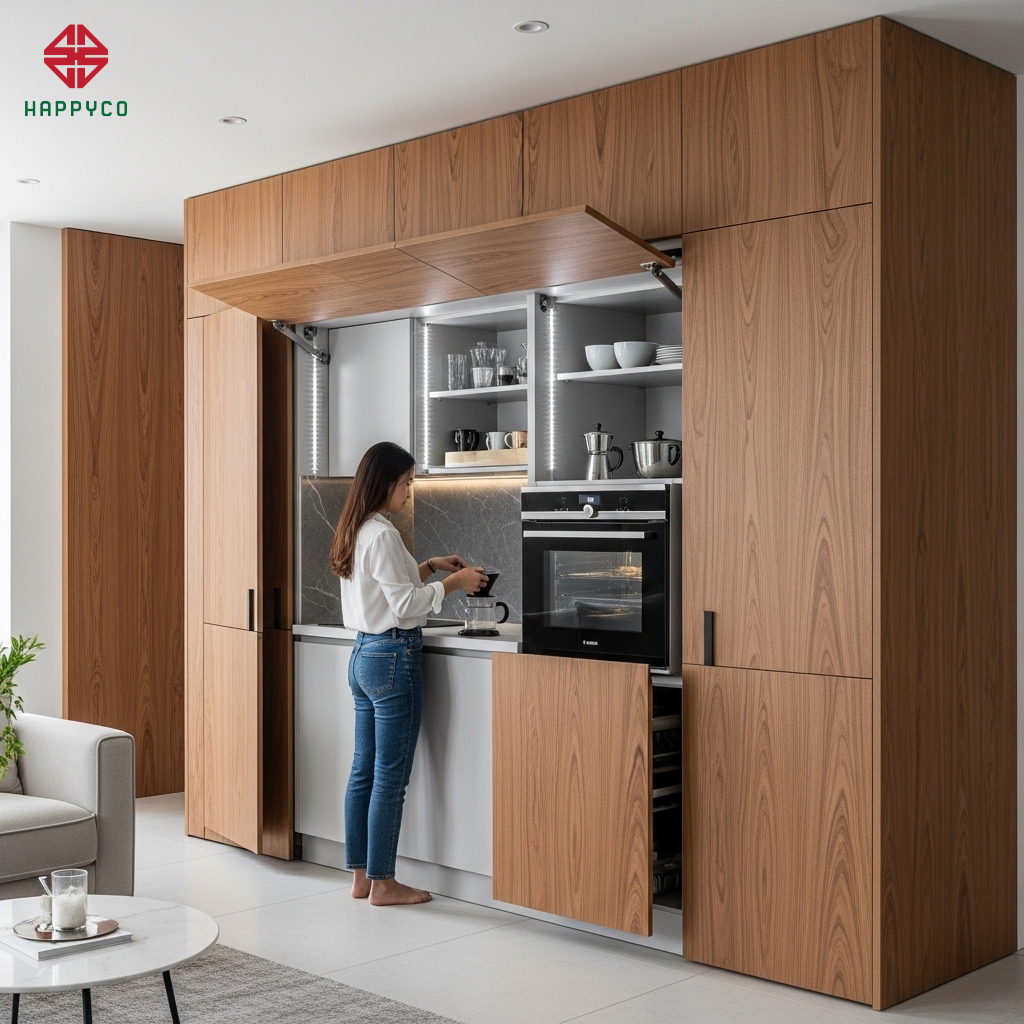 Happy Décor giới thiệu giải pháp Pocket Door (Cánh tủ giấu biến) – một bước đột phá trong kỹ thuật mộc và cơ khí chính xác. Thay vì những cánh cửa mở ra chiếm diện tích, hệ cánh túi cho phép toàn bộ cánh tủ "biến mất" hoàn toàn vào khe vách mộc, biến một gian bếp bận rộn thành một bức tường gỗ phẳng phiêu, tinh tế chỉ trong 3 giây.