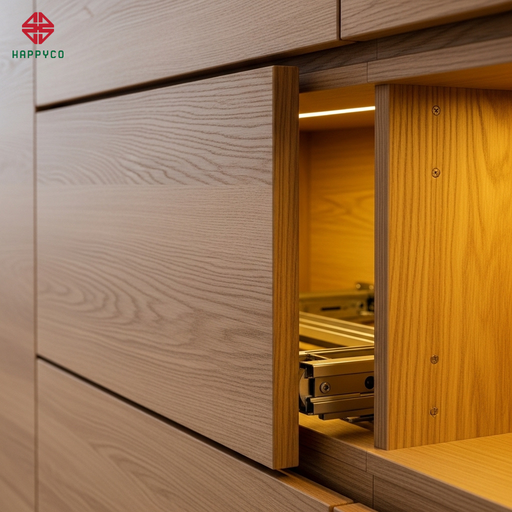 Hệ thống ray định hướng: Happy Décor sử dụng dòng ray trượt cao cấp có giảm chấn và hệ thống thanh giằng cân bằng lực. Dù cánh tủ làm bằng gỗ HMR dày $18\text{mm}$ hay dán Veneer nặng, người nội trợ vẫn có thể đẩy vào nhẹ nhàng bằng một ngón tay. Đây chính là điểm chạm công nghệ mà các dòng bếp thông thường không bao giờ chạm tới được.
