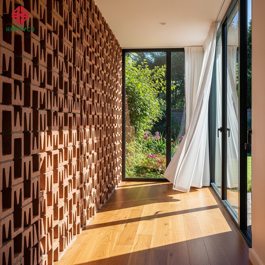 Thiết kế đón sáng đa hướng: Thay vì phụ thuộc vào đèn điện, Happy Décor tận dụng tối đa ánh sáng mặt trời thông qua các hệ cửa kính lùi, giếng trời và gạch thông gió. Ánh sáng tự nhiên thay đổi cường độ theo thời gian trong ngày giúp ổn định hormone và cải thiện chất lượng giấc ngủ cho gia chủ.