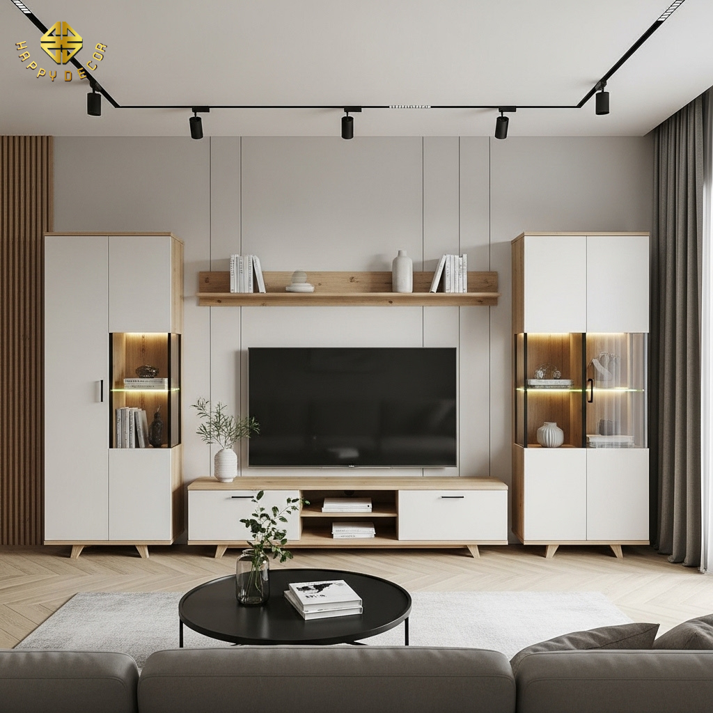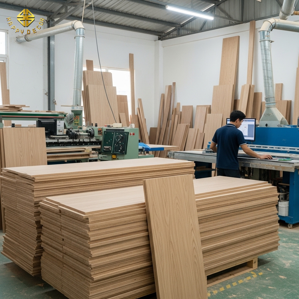 Phân loại khu vực sử dụng: Tại Happy Décor, chúng tôi tư vấn chia không gian thành "vùng khô" và "vùng ẩm". Ở các hệ tủ áo, kệ trang trí tại phòng ngủ (vùng khô), việc sử dụng ván MFC phủ Melamine chất lượng cao là lựa chọn cực kỳ kinh tế mà vẫn đảm bảo độ bền trên 15 năm. Ngân sách tiết kiệm được từ đây sẽ được dồn cho khu vực bếp hoặc nhà vệ sinh – nơi bắt buộc phải dùng cốt ván chống ẩm cao cấp để đảm bảo tuổi thọ công trình.