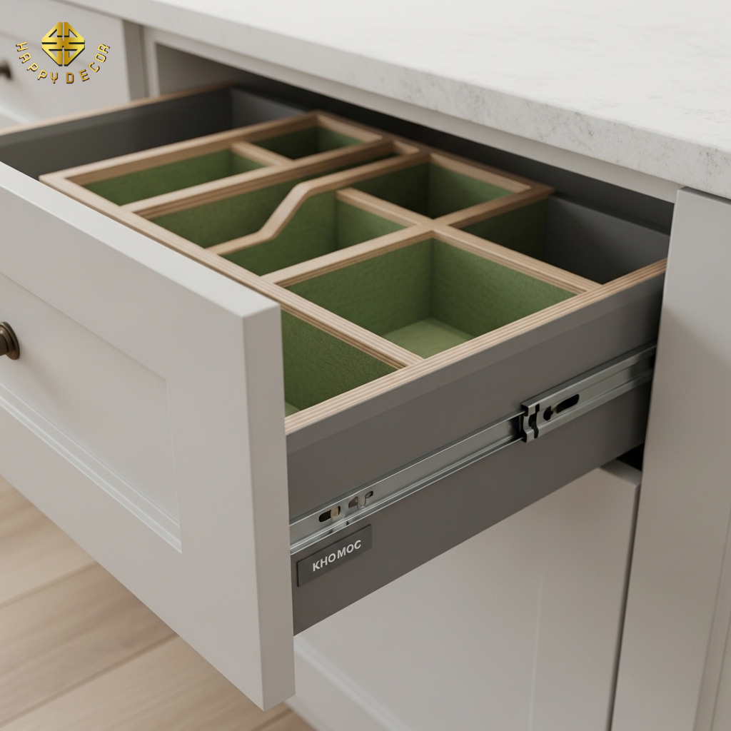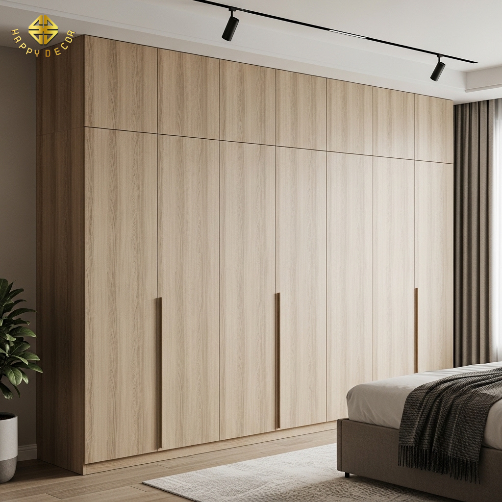 Ưu tiên vận hành êm ái: Happy Décor khuyên bạn nên cắt giảm các chi tiết trang trí cầu kỳ như nẹp vàng, kính mờ đắt đỏ để đầu tư vào hệ bản lề và ray trượt giảm chấn cao cấp. Một bộ tủ trơn phẳng nhưng vận hành mượt mà luôn mang lại cảm giác cao cấp hơn một bộ tủ lộng lẫy nhưng lỗi thời về công năng.