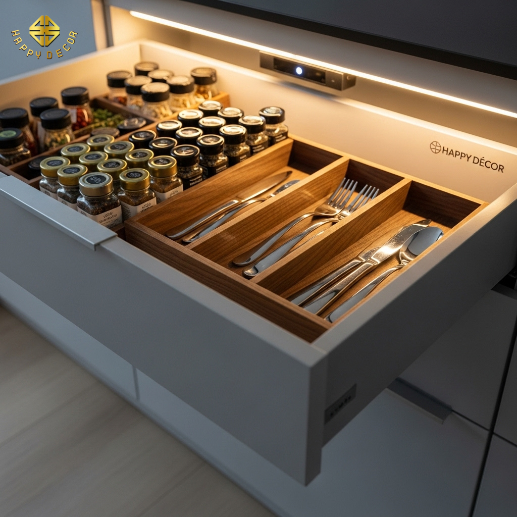 Sức mạnh thực sự của một bộ tủ bếp Happy Décor nằm ở những thứ "ẩn mình" bên trong.