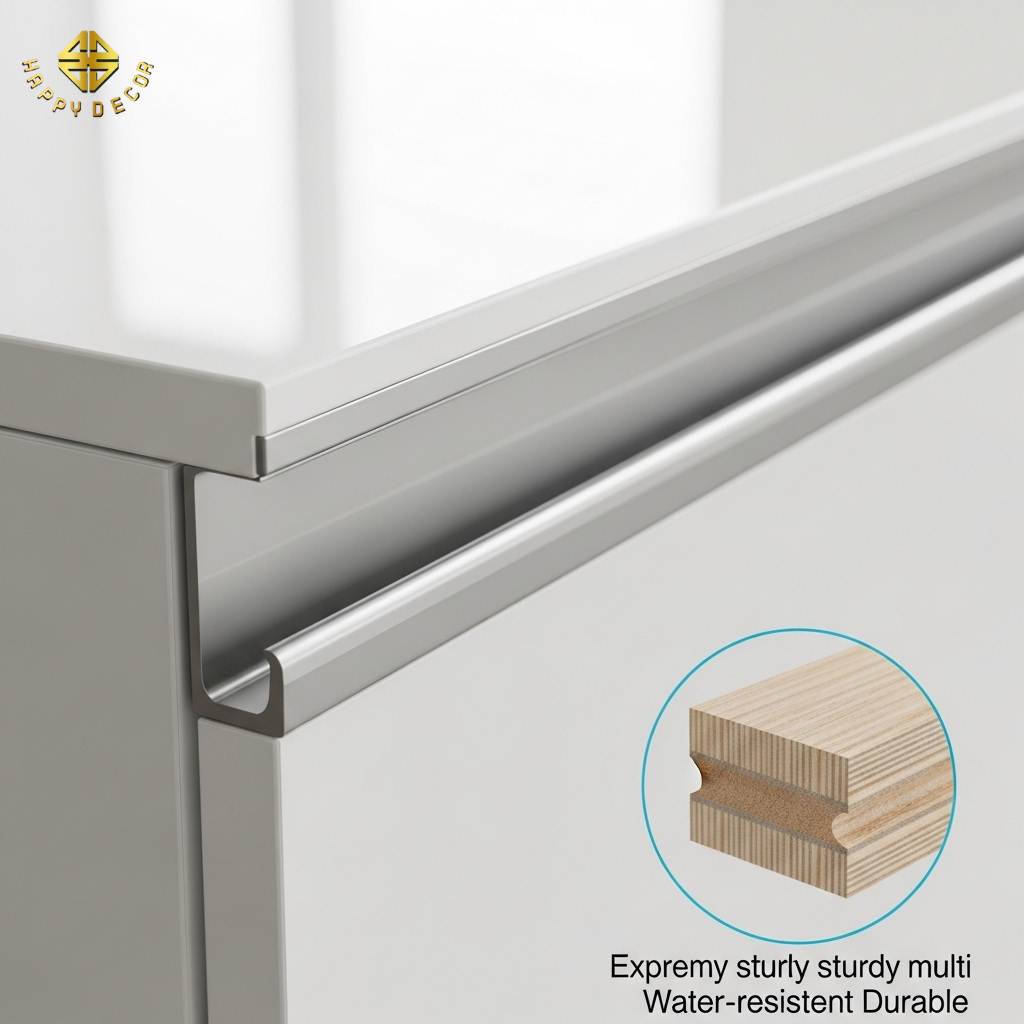 Công nghệ dán cạnh không đường Line: Chúng tôi sử dụng máy dán cạnh tự động công suất lớn để ép lớp Acrylic vào cốt gỗ mà không để lộ đường keo (Noline). Cánh tủ trông như một khối nhựa nguyên khối, bóng gương hoàn hảo, giúp việc lau chùi dầu mỡ chỉ mất vài giây.
