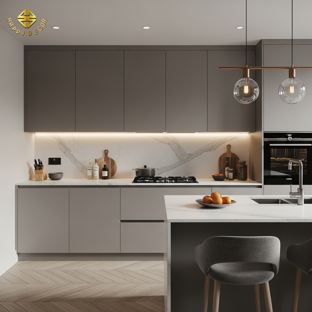 Nhiều gia chủ thường sai lầm khi chỉ chăm chút vào vẻ ngoài bóng bẩy của tủ bếp mà quên mất rằng đây là khu vực khắc nghiệt nhất trong nhà với độ ẩm cao, nhiệt độ lớn và tần suất sử dụng dày đặc. Tại Happy Décor, chúng tôi không thiết kế bếp chỉ để ngắm. Chúng tôi xây dựng một "phòng thí nghiệm ẩm thực" dựa trên Quy tắc Tam giác vàng (Work Triangle) và tiêu chuẩn Công thái học (Ergonomics)