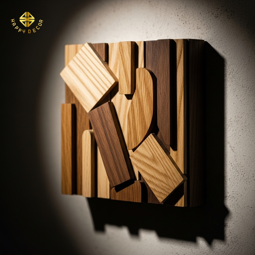 Kỹ thuật: Ghép các miếng gỗ có độ dày và màu sắc khác nhau lên một tấm nền phẳng. Sự lồi lõm và đan xen giữa các loại vân gỗ sẽ tạo nên hiệu ứng 3D cực kỳ ấn tượng cho mảng tường sau sofa hoặc đầu giường.
