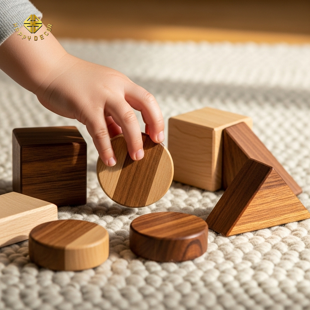 Ý tưởng: Cắt gỗ thành các hình khối cơ bản (tam giác, vuông, tròn), mài nhẵn các cạnh để bé tập xếp hình hoặc tô màu.