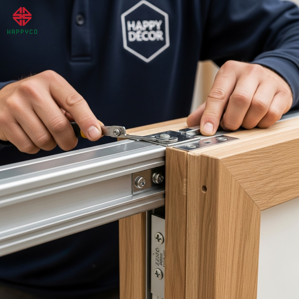 Module ngăn kéo "không tiếng động": Tất cả ngăn kéo tài liệu được trang bị ray trượt giảm chấn hạng nặng của các thương hiệu hàng đầu. Thợ mộc Happy Décor sẽ tính toán độ hở kỹ thuật để khi đóng mở, các bộ phận mộc không va chạm trực tiếp vào nhau, triệt tiêu hoàn toàn âm thanh kim loại hay gỗ va đập.